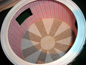 This was a fun recycling project. The building is made from a large mixed nuts can. The flooring is made from leftovers from a real home project. The wall shelves were made from the can lid. The work table is a pizza table that I cut down and the light fixture was made from a chocolate syrup lid. The stones are egg carton and other similar packing materials. The only thing I purchased for the project was the floral foam dome that I used for the roof.More progress on the round thing